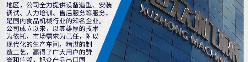 廣州旭眾食品機械有限公司是一家集科研開發,生產設計,營銷服務為一體的現代化生產企業。現代化生產車間,精湛制造技術,所產機械歷經市場重重考驗,不斷贏得海內外客戶的贊譽。