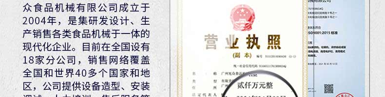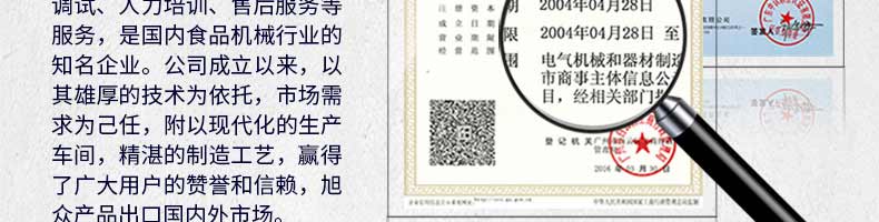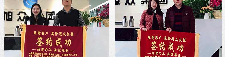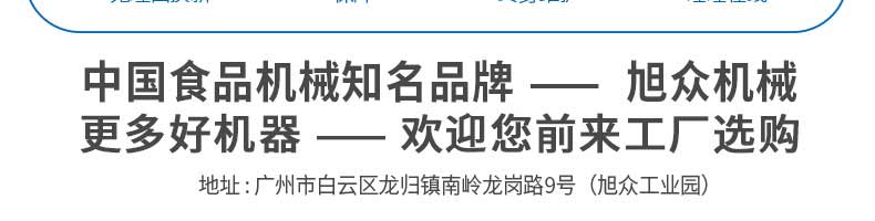 廣州旭眾食品機械有限公司是一家集科研開發(fā),生產(chǎn)設計,營銷服務為一體的現(xiàn)代化生產(chǎn)企業(yè)。現(xiàn)代化生產(chǎn)車間,精湛制造技術(shù),所產(chǎn)機械歷經(jīng)市場重重考驗,不斷贏得海內(nèi)外客戶的贊譽。