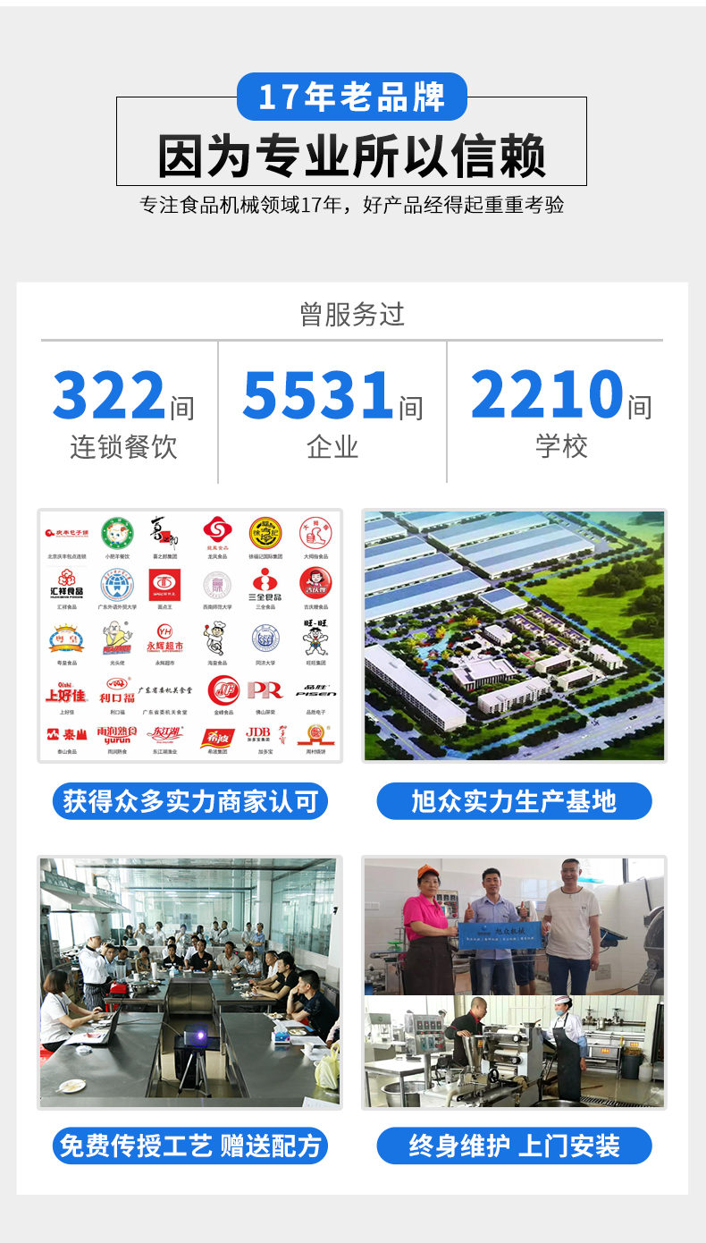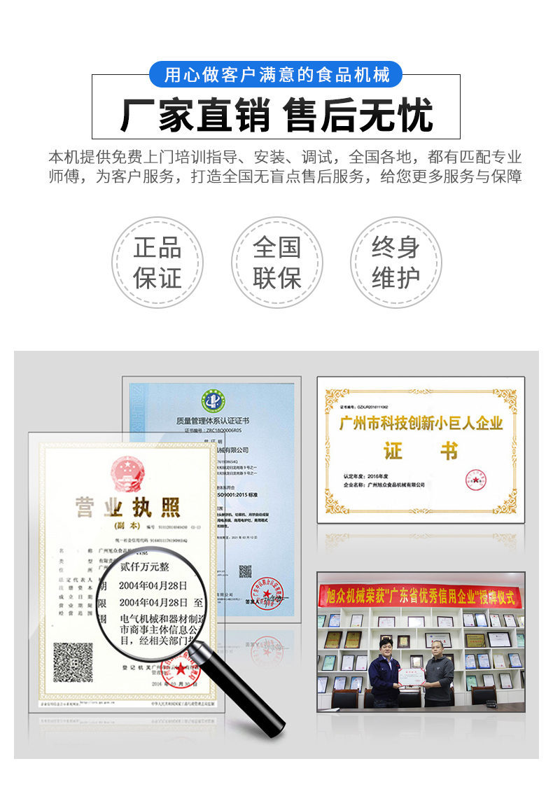 廣州旭眾食品機(jī)械有限公司是一家集科研開發(fā),生產(chǎn)設(shè)計,營銷服務(wù)為一體的現(xiàn)代化生產(chǎn)企業(yè)。現(xiàn)代化生產(chǎn)車間,精湛制造技術(shù),所產(chǎn)機(jī)械歷經(jīng)市場重重考驗,不斷贏得海內(nèi)外客戶的贊譽(yù)。