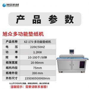 XZ-170多功能墊紙機,適用于大規模生產多功能墊紙機適用于包子、饅頭、豆包等需要墊包紙的食。伺服控制、墊紙長度可調整。高效墊紙告別人工旭眾牌ⅩZ-170多功能墊紙機適用于規模生產的食品企業制作包子機、饅頭等食品的自動墊包紙設備。