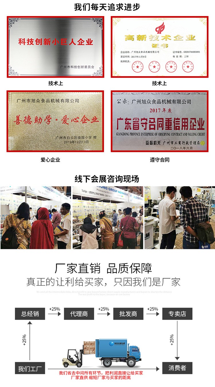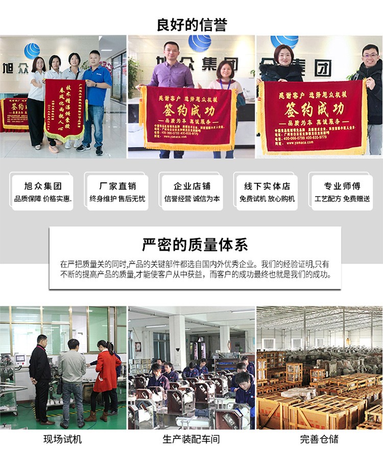 廣州旭眾食品機(jī)械有限公司是一家集科研開發(fā),生產(chǎn)設(shè)計(jì),營銷服務(wù)為一體的現(xiàn)代化生產(chǎn)企業(yè)。現(xiàn)代化生產(chǎn)車間,精湛制造技術(shù),所產(chǎn)機(jī)械歷經(jīng)市場(chǎng)重重考驗(yàn),不斷贏得海內(nèi)外客戶的贊譽(yù)。