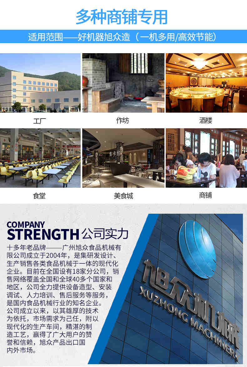 廣州旭眾食品機(jī)械有限公司是一家集科研開(kāi)發(fā),生產(chǎn)設(shè)計(jì),營(yíng)銷服務(wù)為一體的現(xiàn)代化生產(chǎn)企業(yè)?,F(xiàn)代化生產(chǎn)車間,精湛制造技術(shù),所產(chǎn)機(jī)械歷經(jīng)市場(chǎng)重重考驗(yàn),不斷贏得海內(nèi)外客戶的贊譽(yù)。