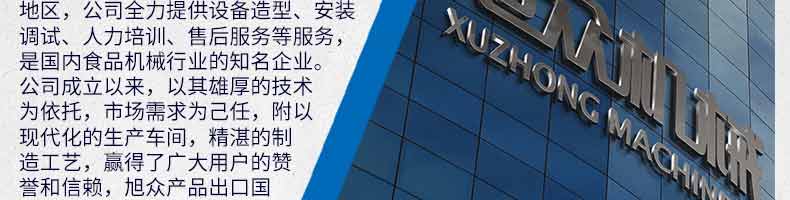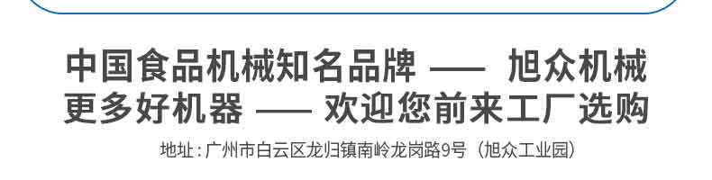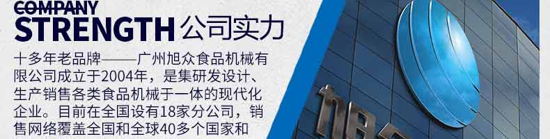 廣州旭眾食品機械有限公司是一家集科研開發(fā),生產(chǎn)設(shè)計,營銷服務(wù)為一體的現(xiàn)代化生產(chǎn)企業(yè)。現(xiàn)代化生產(chǎn)車間,精湛制造技術(shù),所產(chǎn)機械歷經(jīng)市場重重考驗,不斷贏得海內(nèi)外客戶的贊譽。