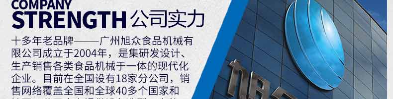廣州旭眾食品機械有限公司是一家集科研開發,生產設計,營銷服務為一體的現代化生產企業?,F代化生產車間,精湛制造技術,所產機械歷經市場重重考驗,不斷贏得海內外客戶的贊譽。