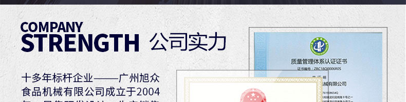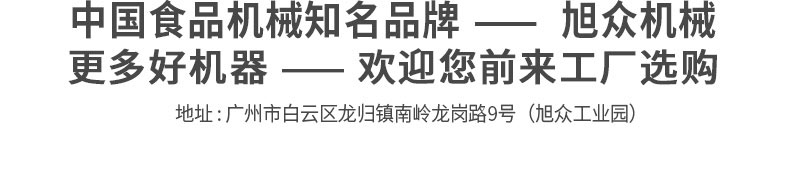 廣州旭眾食品機械有限公司是一家集科研開發(fā),生產(chǎn)設(shè)計,營銷服務(wù)為一體的現(xiàn)代化生產(chǎn)企業(yè)。現(xiàn)代化生產(chǎn)車間,精湛制造技術(shù),所產(chǎn)機械歷經(jīng)市場重重考驗,不斷贏得海內(nèi)外客戶的贊譽。