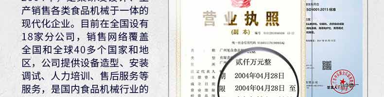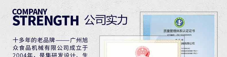 廣州旭眾食品機械有限公司是一家集科研開發,生產設計,營銷服務為一體的現代化生產企業。現代化生產車間,精湛制造技術,所產機械歷經市場重重考驗,不斷贏得海內外客戶的贊譽。