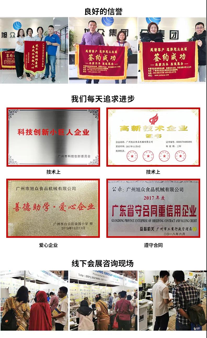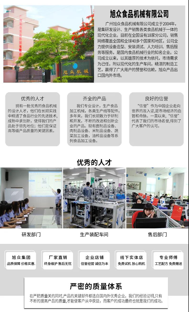 廣州旭眾食品機(jī)械有限公司是一家集科研開發(fā),生產(chǎn)設(shè)計(jì),營(yíng)銷服務(wù)為一體的現(xiàn)代化生產(chǎn)企業(yè)。現(xiàn)代化生產(chǎn)車間,精湛制造技術(shù),所產(chǎn)機(jī)械歷經(jīng)市場(chǎng)重重考驗(yàn),不斷贏得海內(nèi)外客戶的贊譽(yù)。