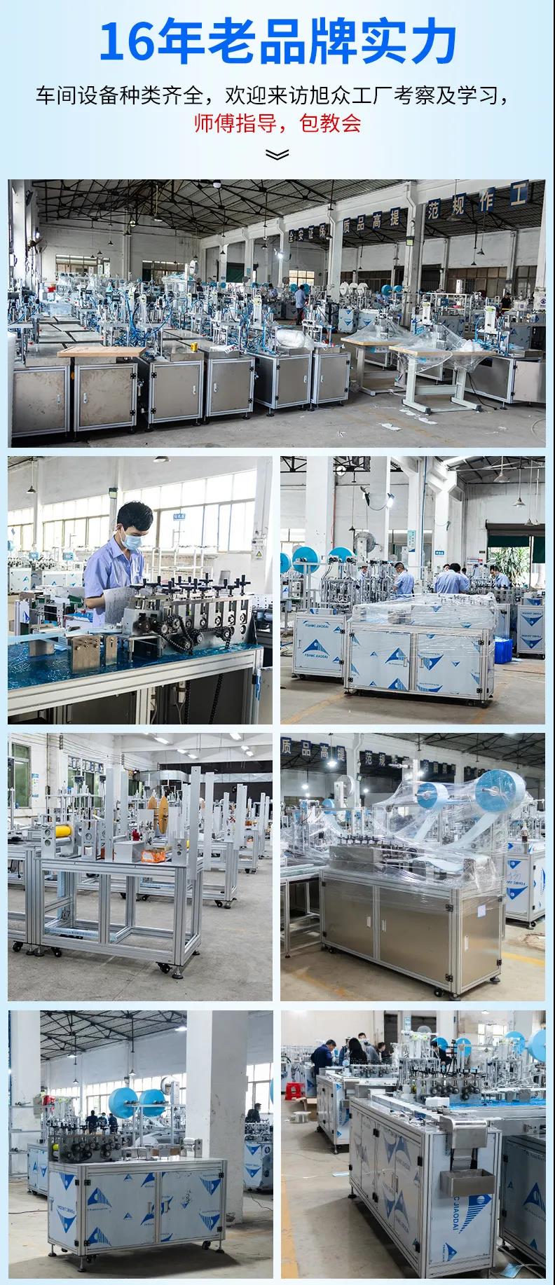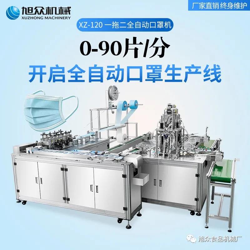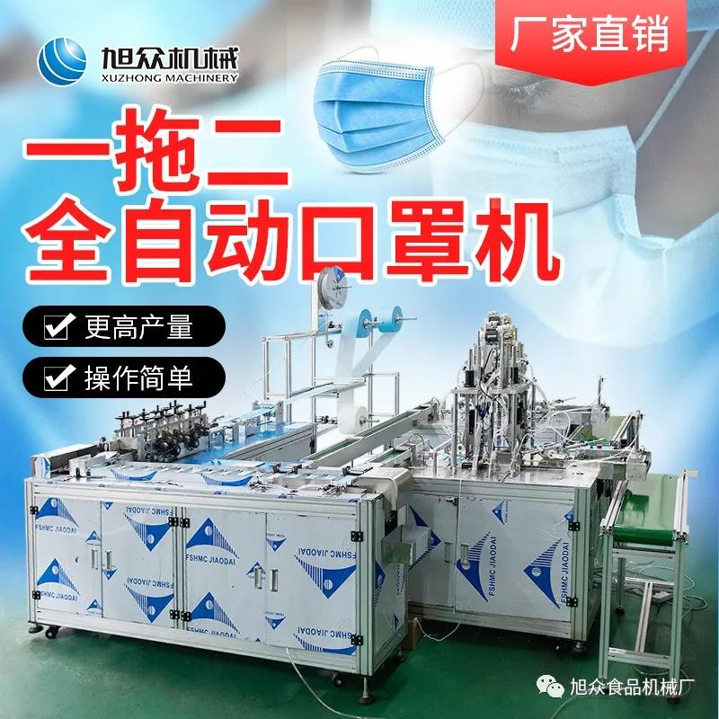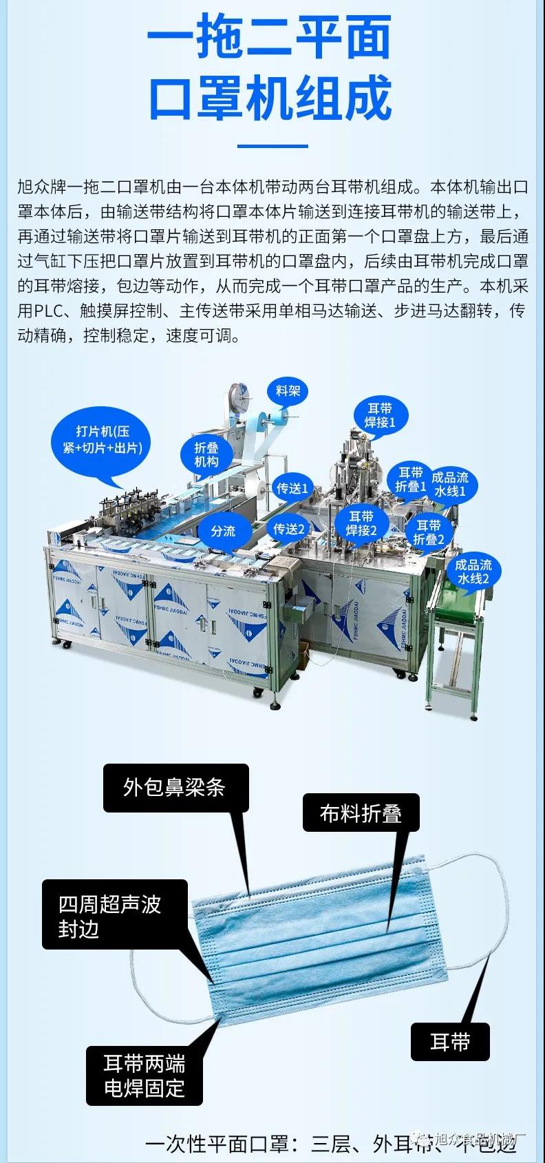 旭眾牌一拖二口罩機由一臺本體機帶動兩臺耳帶機組成。本體機輸出ロ罩本體后,由輸送帶結構將口罩本體片輸送到連接耳帶機的輸送帶上,再通過輸送帶將口罩片輸送到耳帶機的正面第一個口罩盤上方,最后通過氣缸下壓把口罩片放置到耳帶機的口罩盤內,后續由耳帶機完成口罩的耳帶熔接,包邊等動作,從而完成一個耳帶口罩產品的生產。本機采用PLC、觸摸屏控制、主傳送帶采用單相馬達輸送、步進馬達翻轉,傳動精確,控制穩定,速度可調。