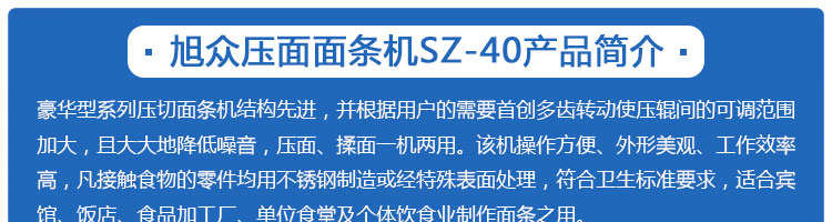 SZ-50、SZ-70壓面面條機(jī)系列,本機(jī)壓面、揉面一機(jī)兩用,用于制作面條、云吞皮、糕點(diǎn)、面點(diǎn)等食品,生產(chǎn)的產(chǎn)品韌性大、耐煮、不易斷,適合于賓館、飯店、食堂、面包廠及各類面點(diǎn)加工單位或個(gè)體商戶使用。