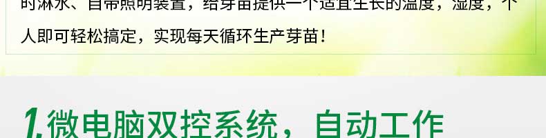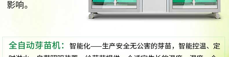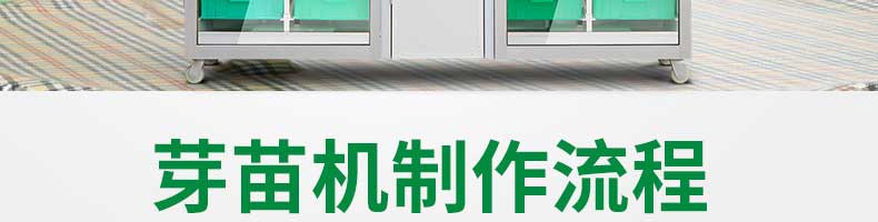 芽苗機(jī)系列,全自動芽苗機(jī):智能化一生產(chǎn)安全無公害的芽苗,智能控溫、定時淋水、自帶照明裝置,給芽苗提供一個適宜生長的溫度,濕度,個人即可輕松搞定,實(shí)現(xiàn)每天循環(huán)生產(chǎn)芽苗!